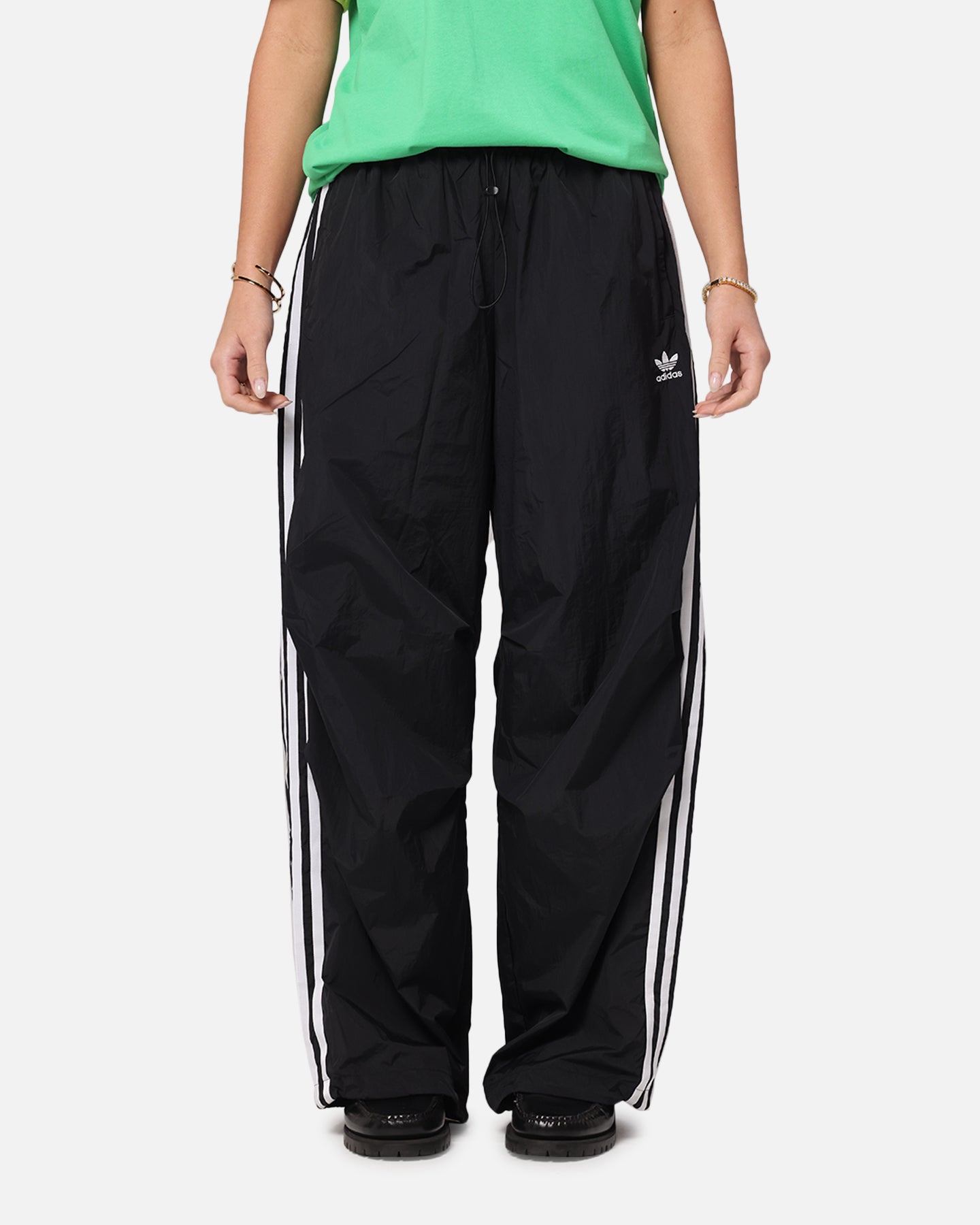 With their loose, relaxed shape, these Adidas parachute pants were made to move with you. Iconic 3-stripes down the legs keep the vibe sporty while plain weave fabric adds easygoing comfort. Whether paired with trainers or sandals, these pants seamlessly blend sport-inspired style into your every day. Cop yours today at Culture Kings.- Embroidered logo- Elasticated waist- Bungee-adjustable hems- Dual side pockets- Relaxed fit- Material: 100% polyamide- Colour: Black- Style: IY7251