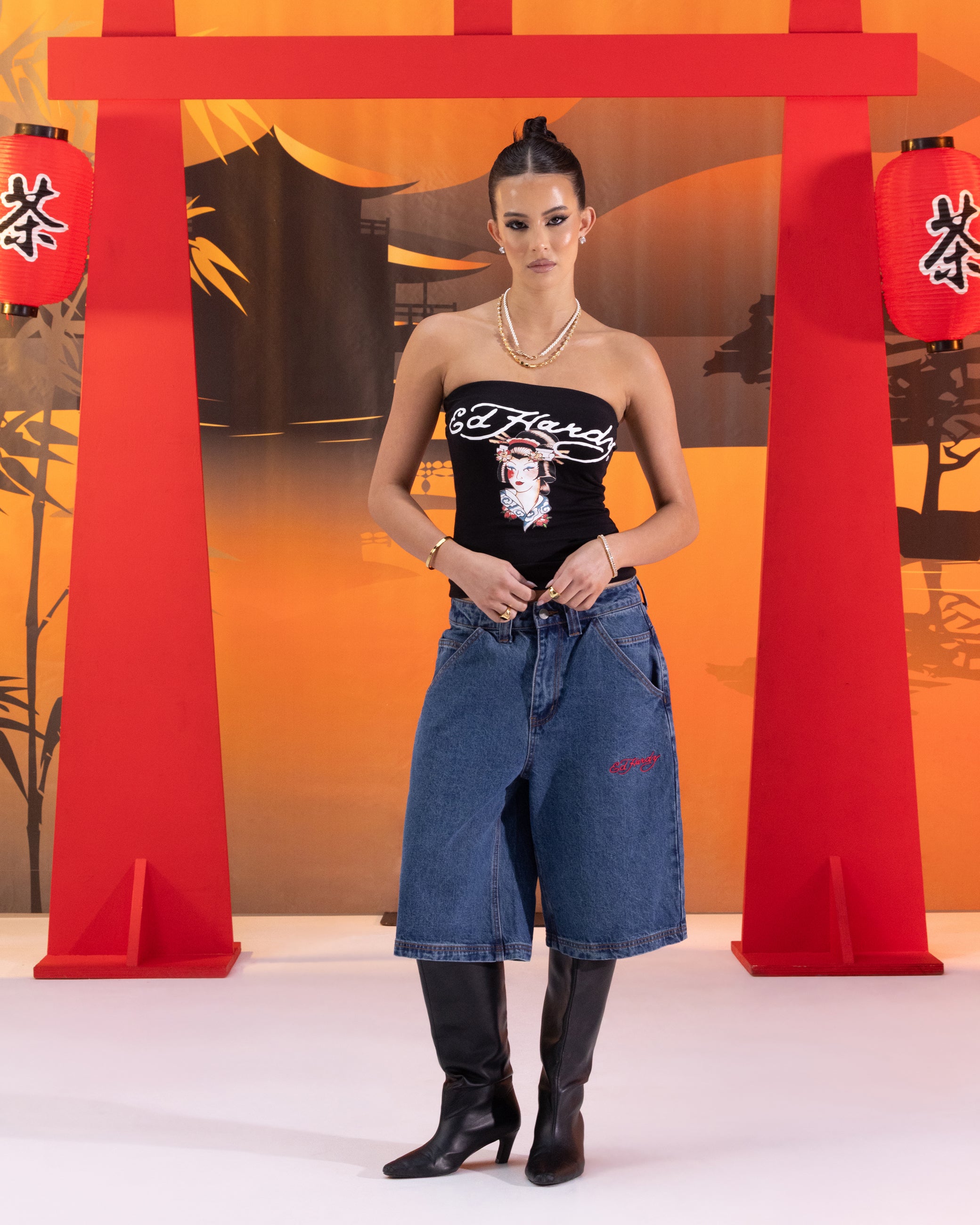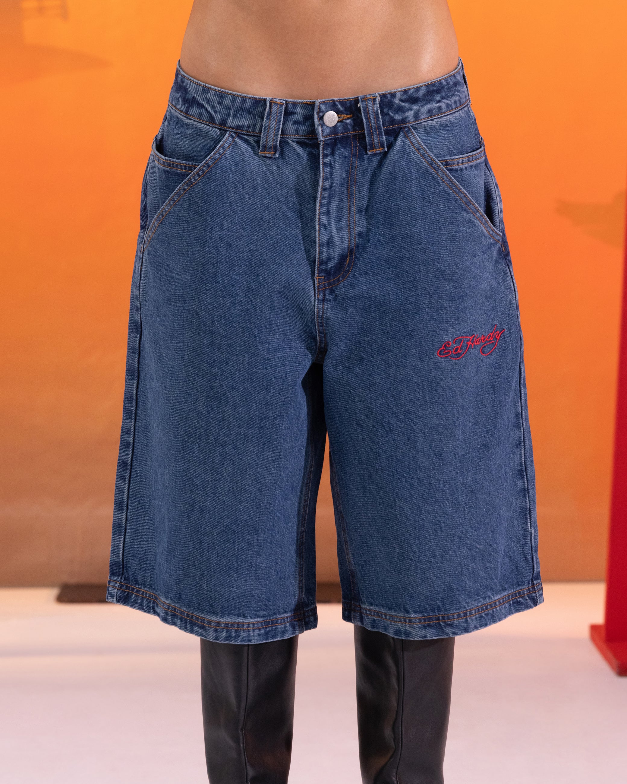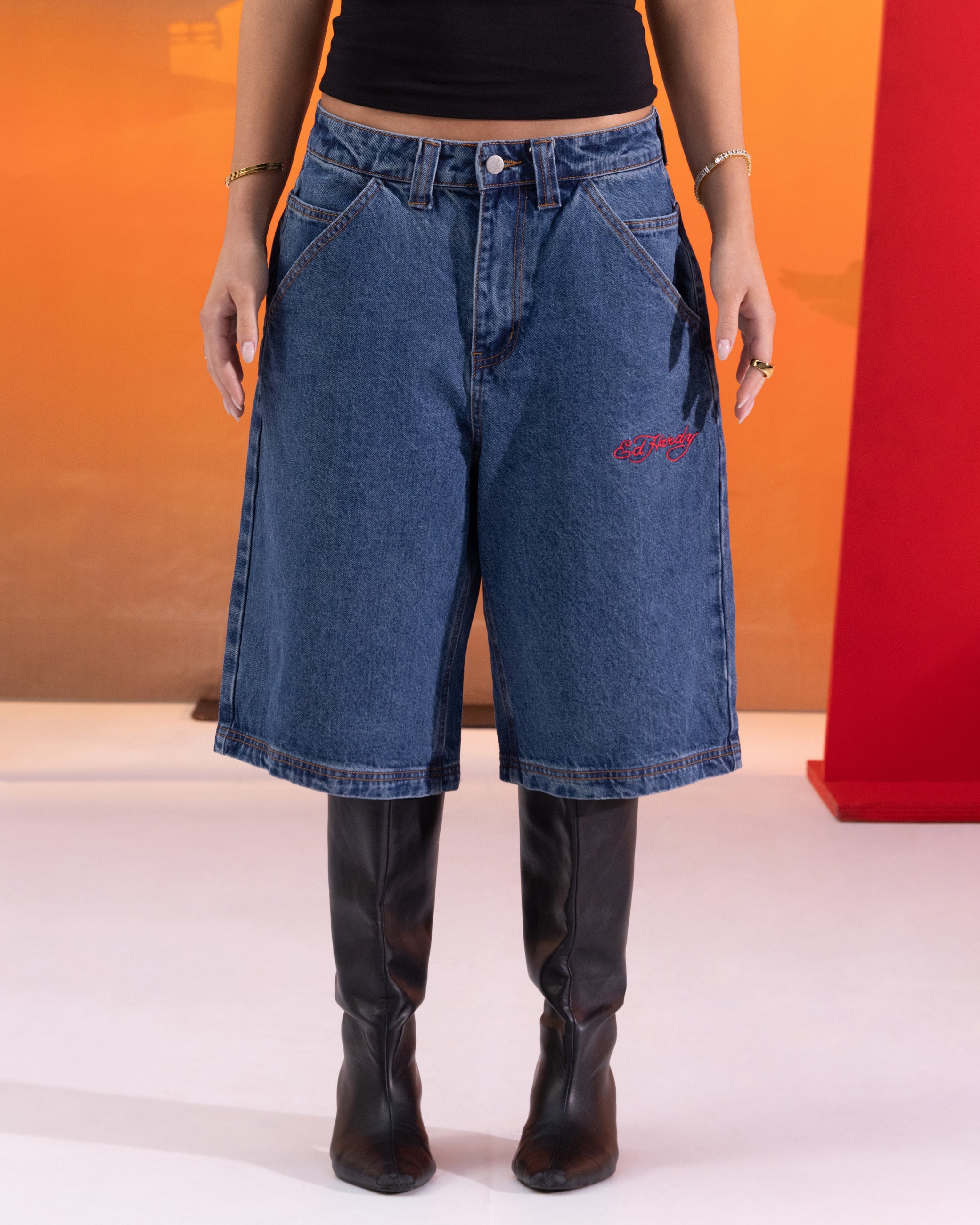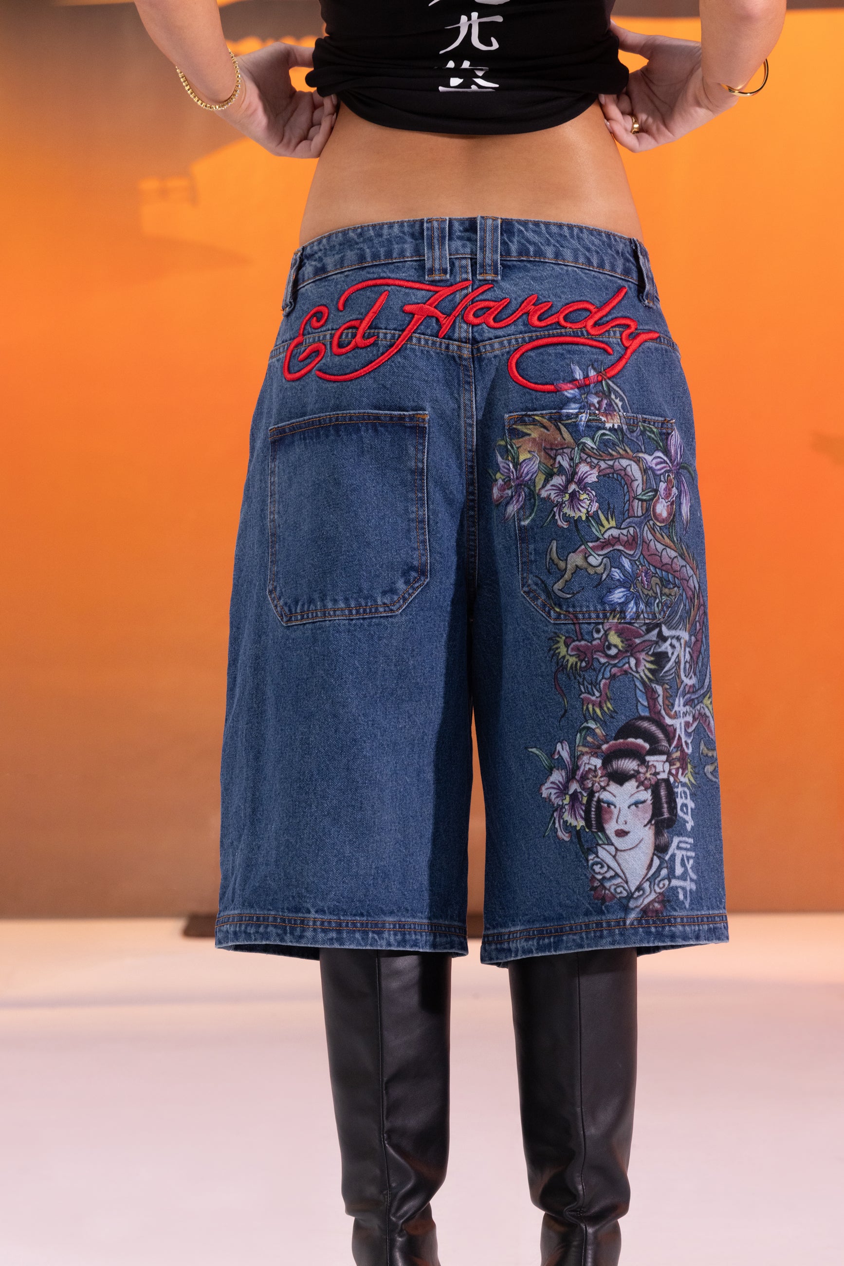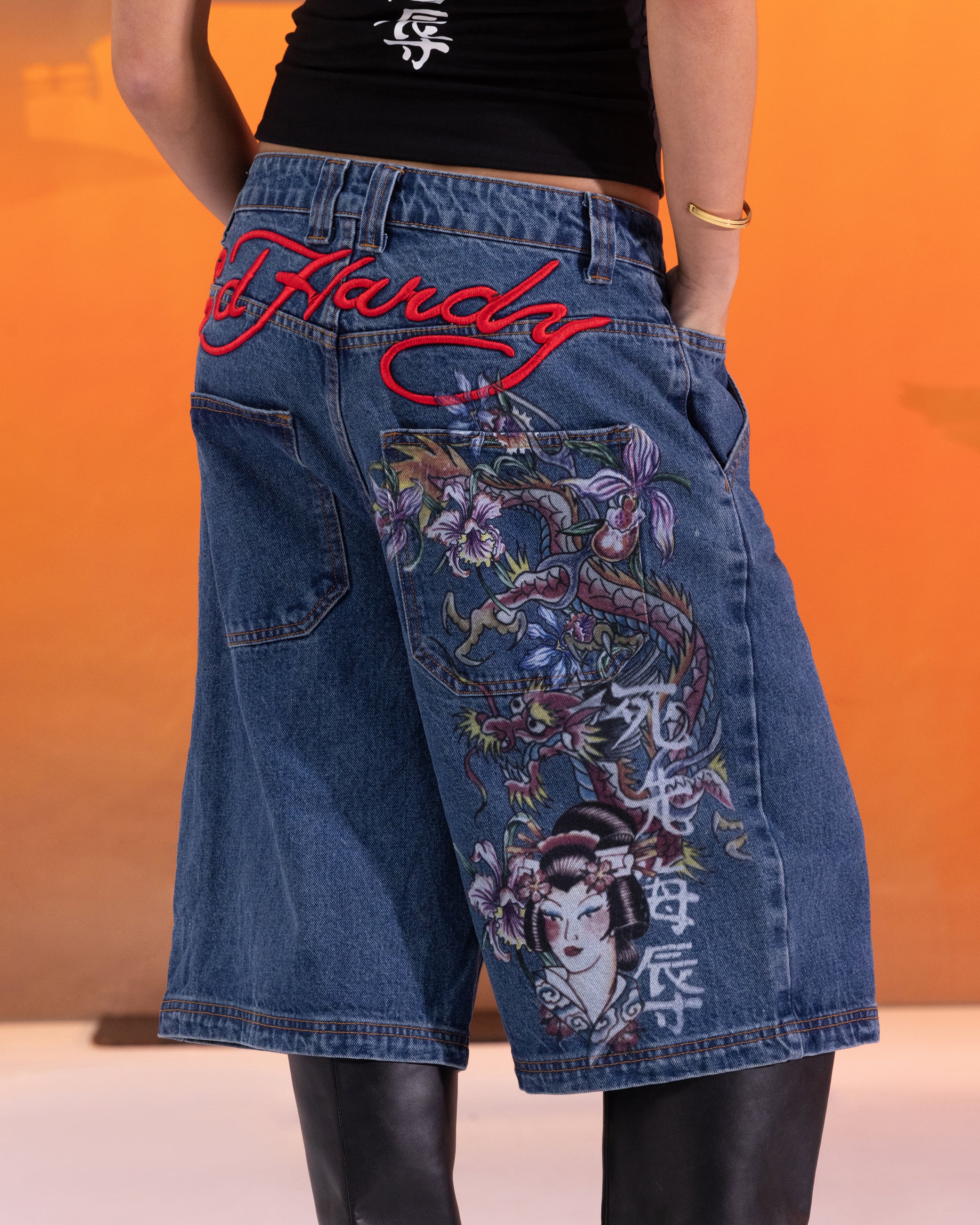 Dive into a world of bold expression with the Ed Hardy Women's Death Before Dishonour Jorts. Infused with a mix of embroidered and printed graphics to showcase the brand's iconic tattoo art, these jorts combine edgy style with exceptional comfort. Crafted from premium denim, with a relaxed fit and perfect length, they offer versatility for both casual outings and adventurous summer days. Cop yours today at Culture Kings.- Denim- Embroidered- Contrast stitching- Printed graphics- Stitched Appliqués- Zip fly and button close- Belt loops- Dual side pockets- Dual back pockets- Twin needle stitching- Baggy fit- Colour: Blue Mid Wash- Style: EHDEATHBFDSHNRJT