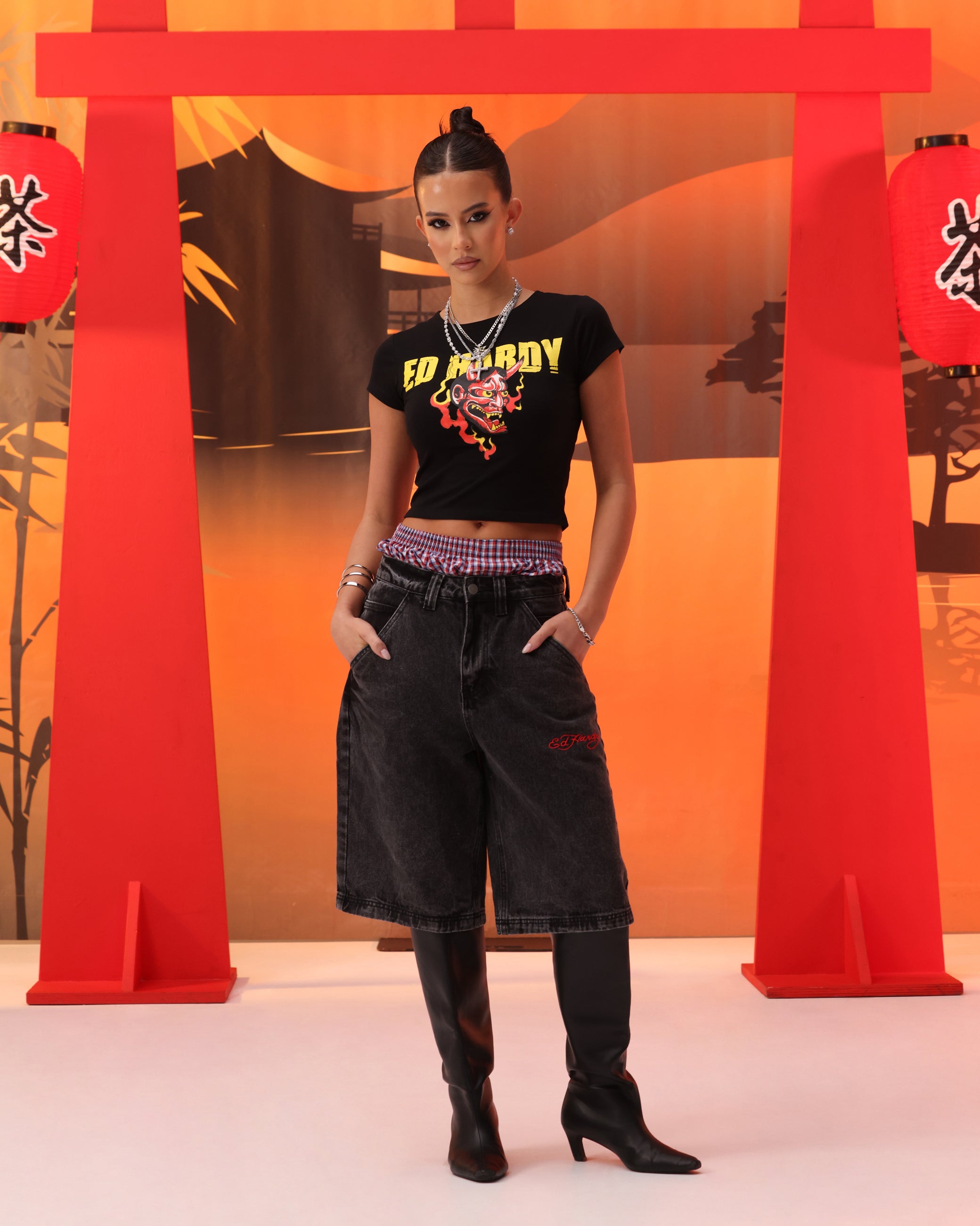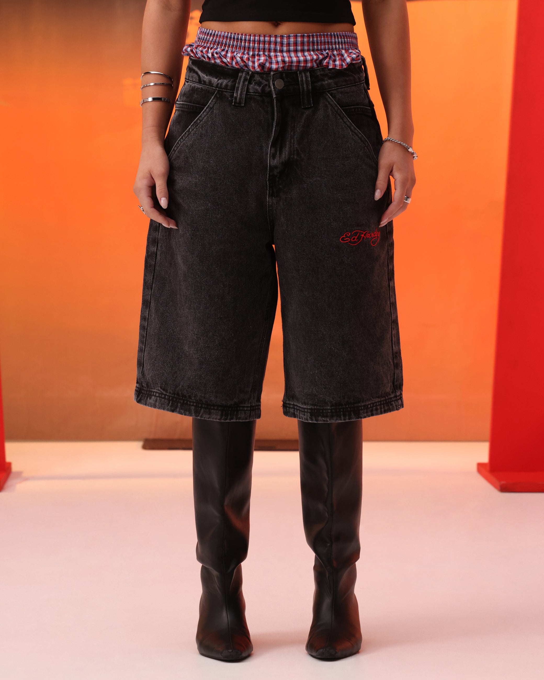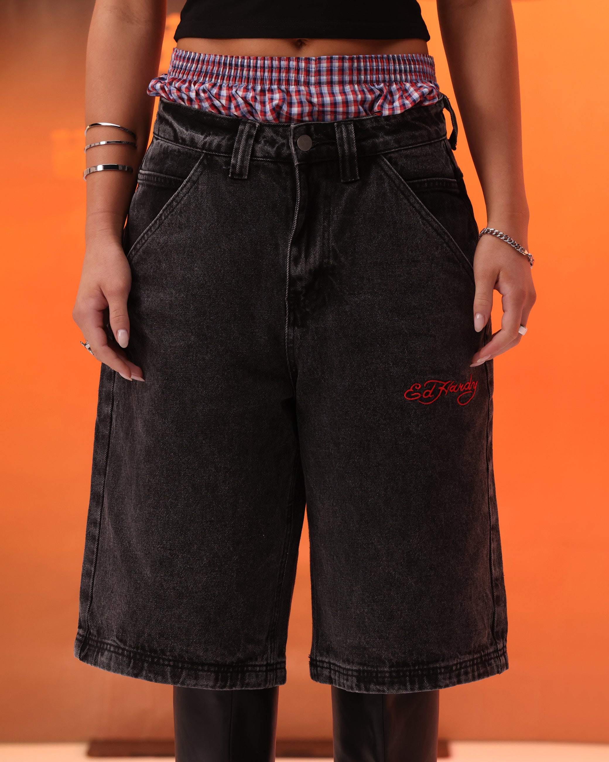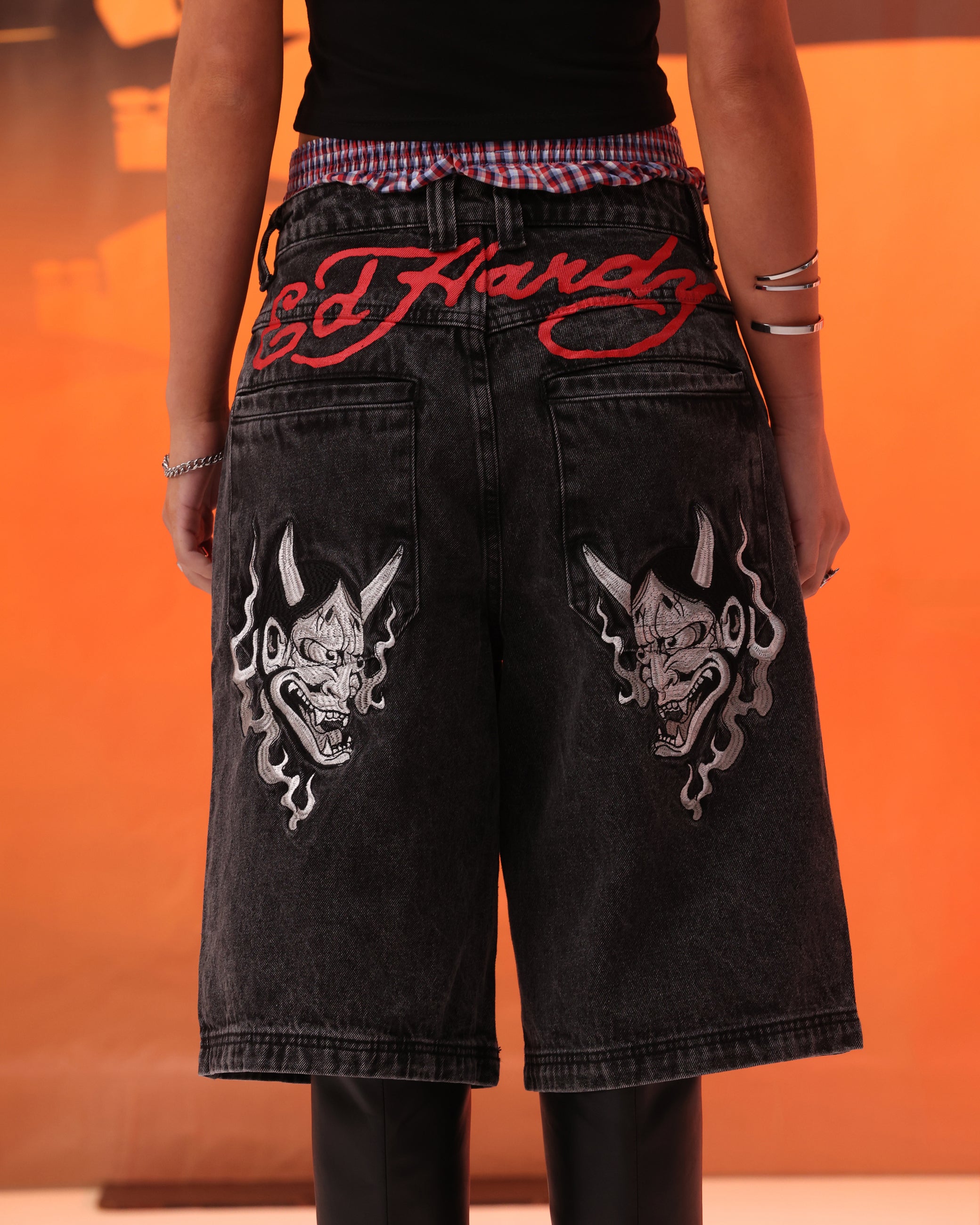 Dive into a world of bold expression with the Ed Hardy Denim Devil Jorts. Infused with a mix of embroidered and printed graphics to showcase the brand's iconic tattoo art, these jorts combine edgy style with exceptional comfort. Crafted from premium denim, with a relaxed fit and perfect length, they offer versatility for both casual outings and adventurous summer days. Cop yours today at Culture Kings.- Denim- Embroidered- Contrast stitching- Printed graphics- Zip fly and button close- Belt loops- Dual side pockets- Dual back pockets- Twin needle stitching- Baggy fit- Colour: Black- Style: EHDEVILJORT