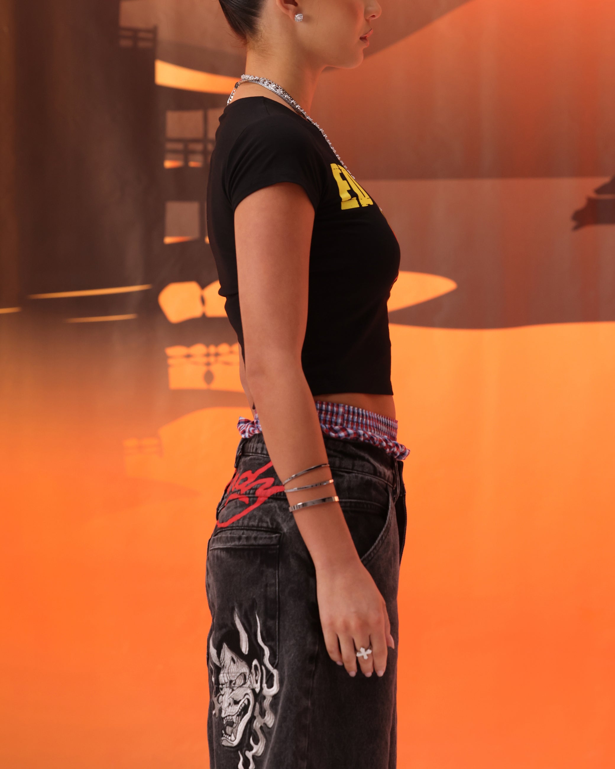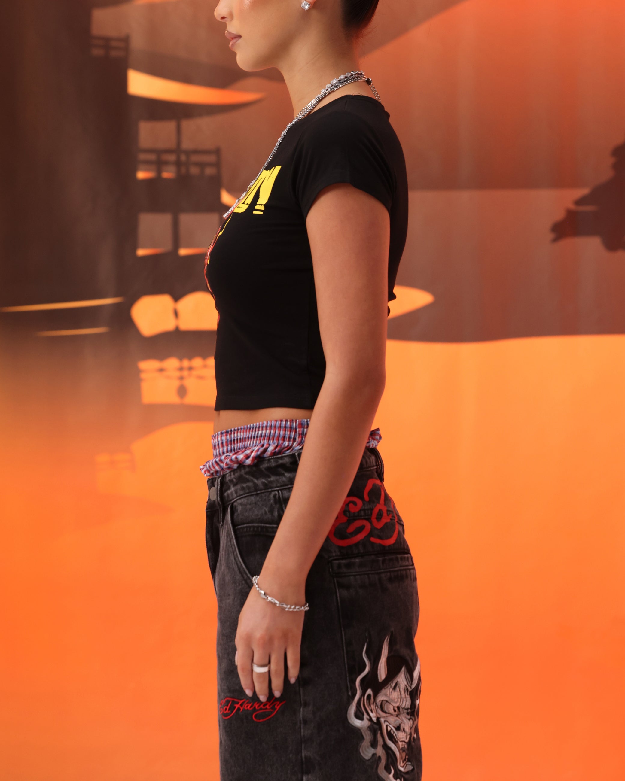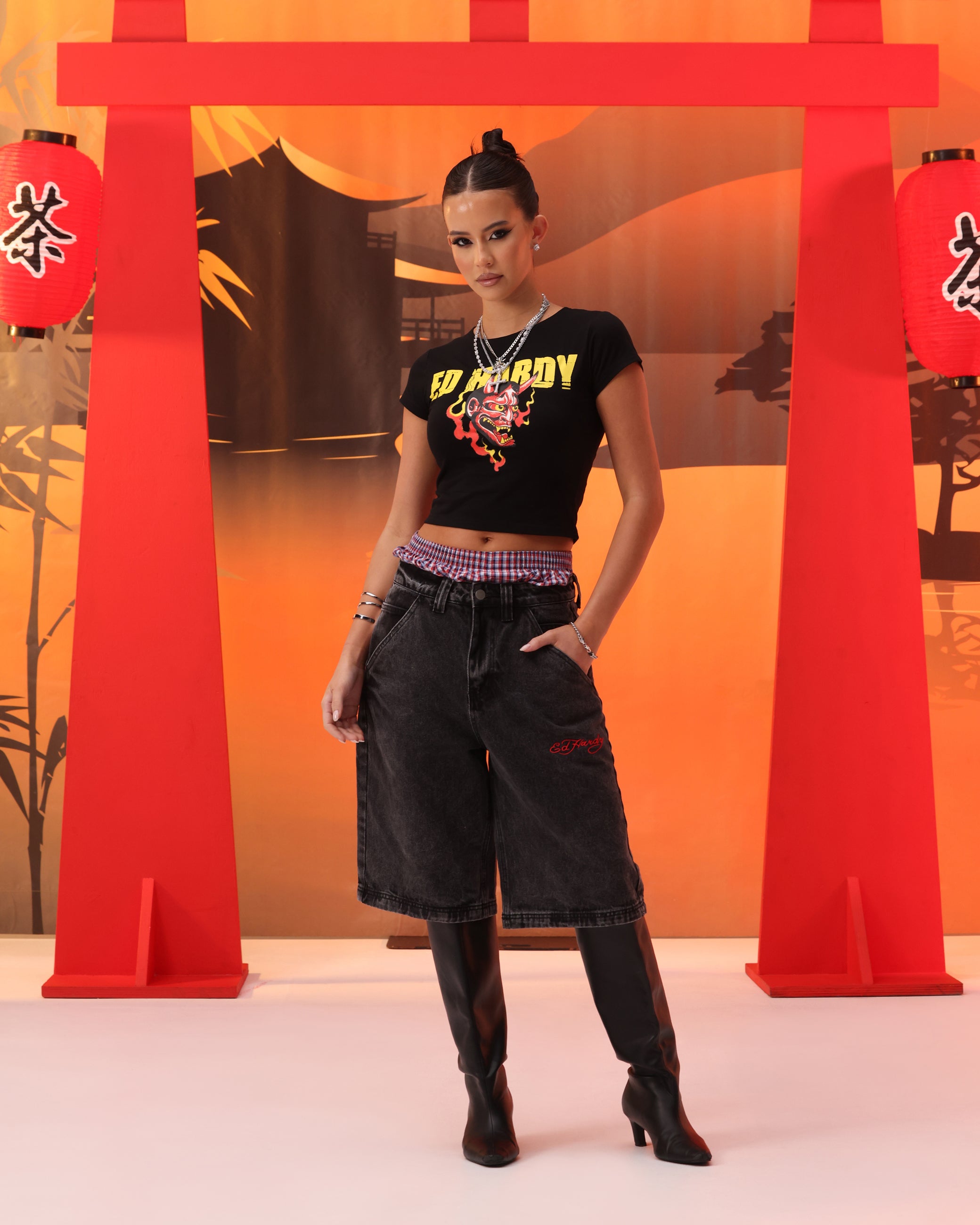 Dive into the world where bold art meets fearless fashion. This limited-edition Women's Blaze Baby T-Shirt features stylish printed graphics that pay homage to Ed Hardy’s legendary vibrant street art designs. Finished with twin-needle stitching that is made to last and has a slim fit for an effortless style. Make a statement that’s unapologetically you and cop yours today while stocks last.- Printed graphics- Ribbed crewneck- Twin needle stitching- Short sleeves- Vintage wash- Regular fit- Cropped- Colour: Black- Style: EHBLAZEBABYT