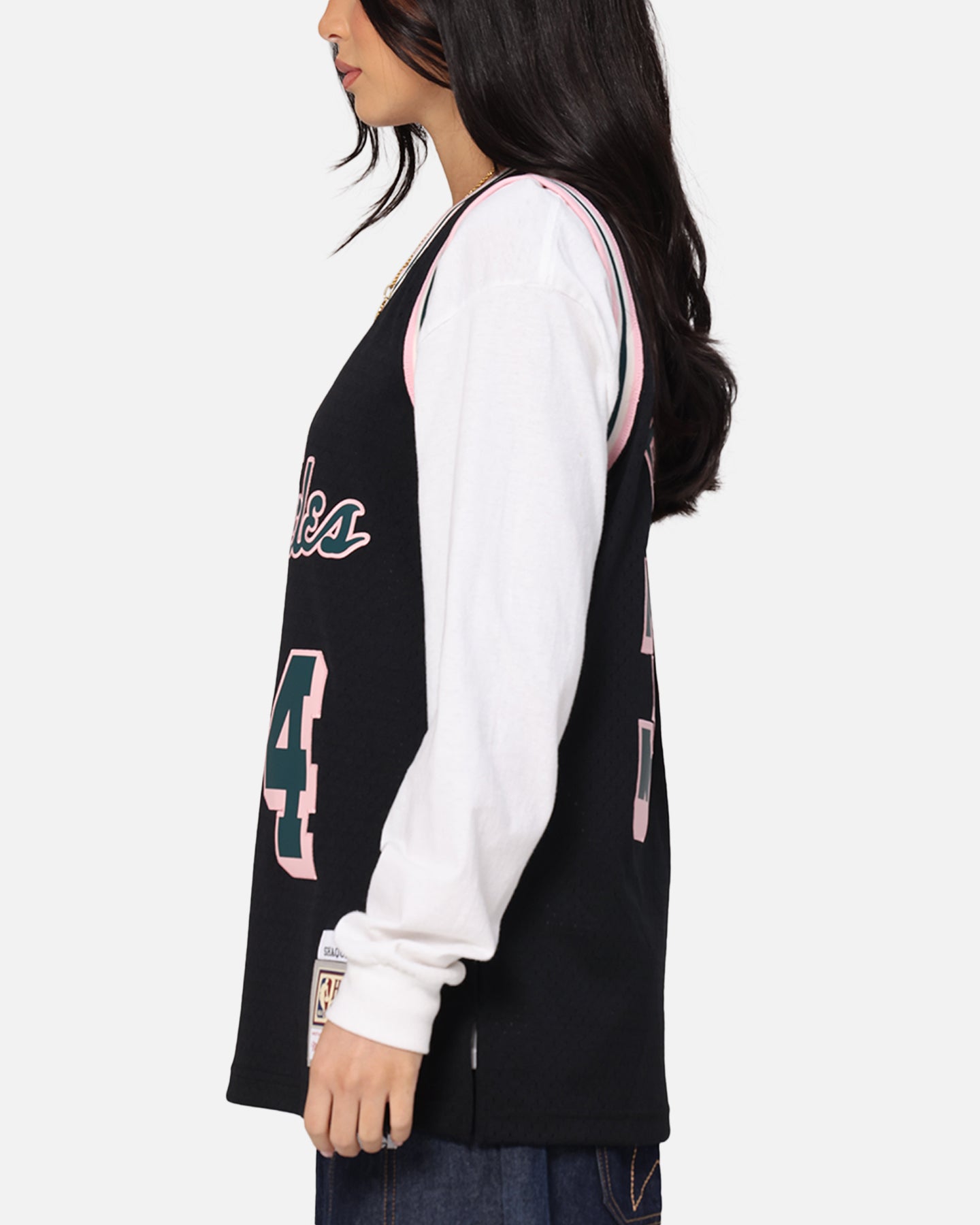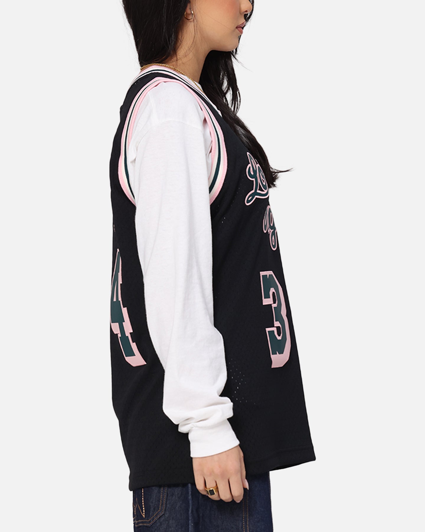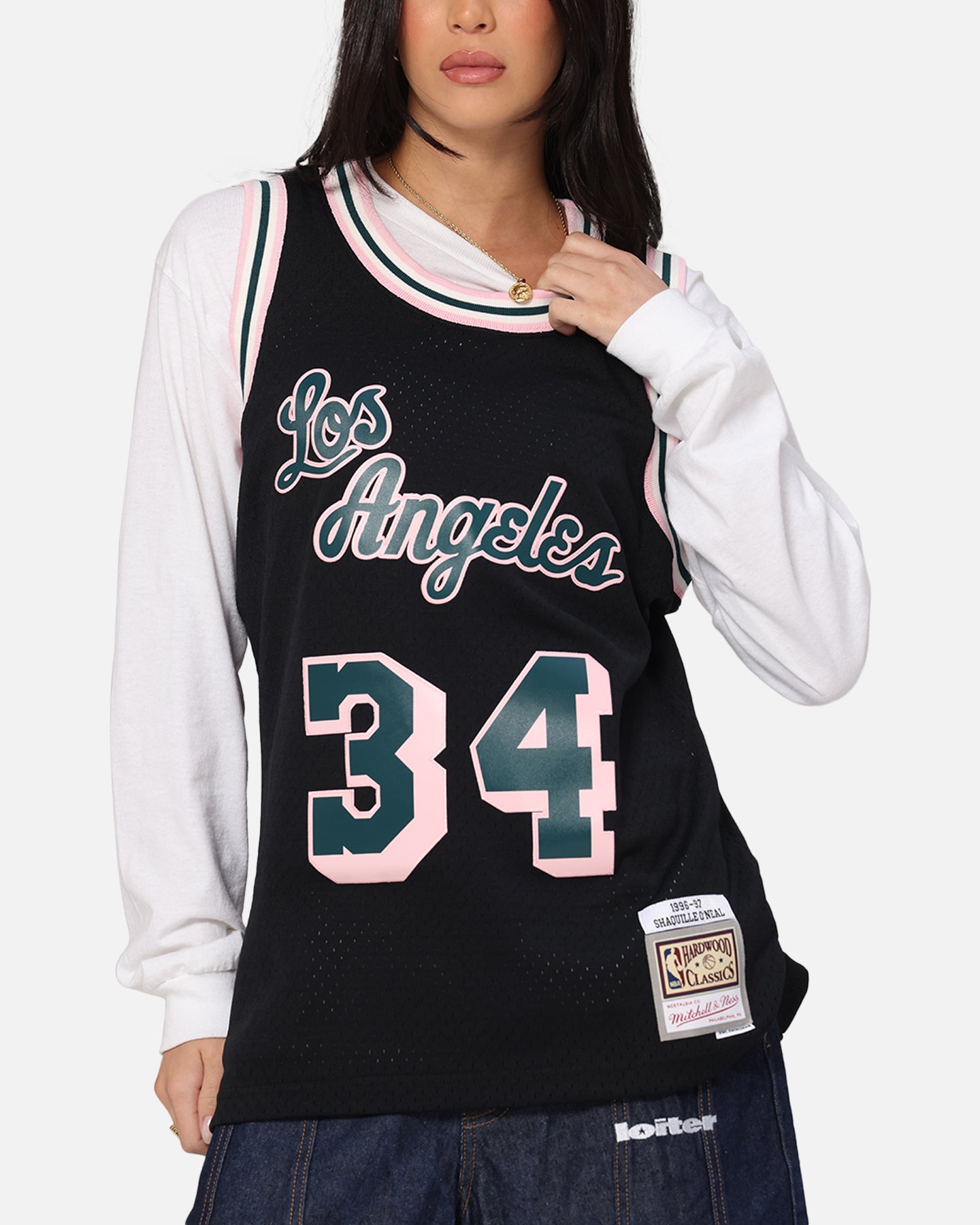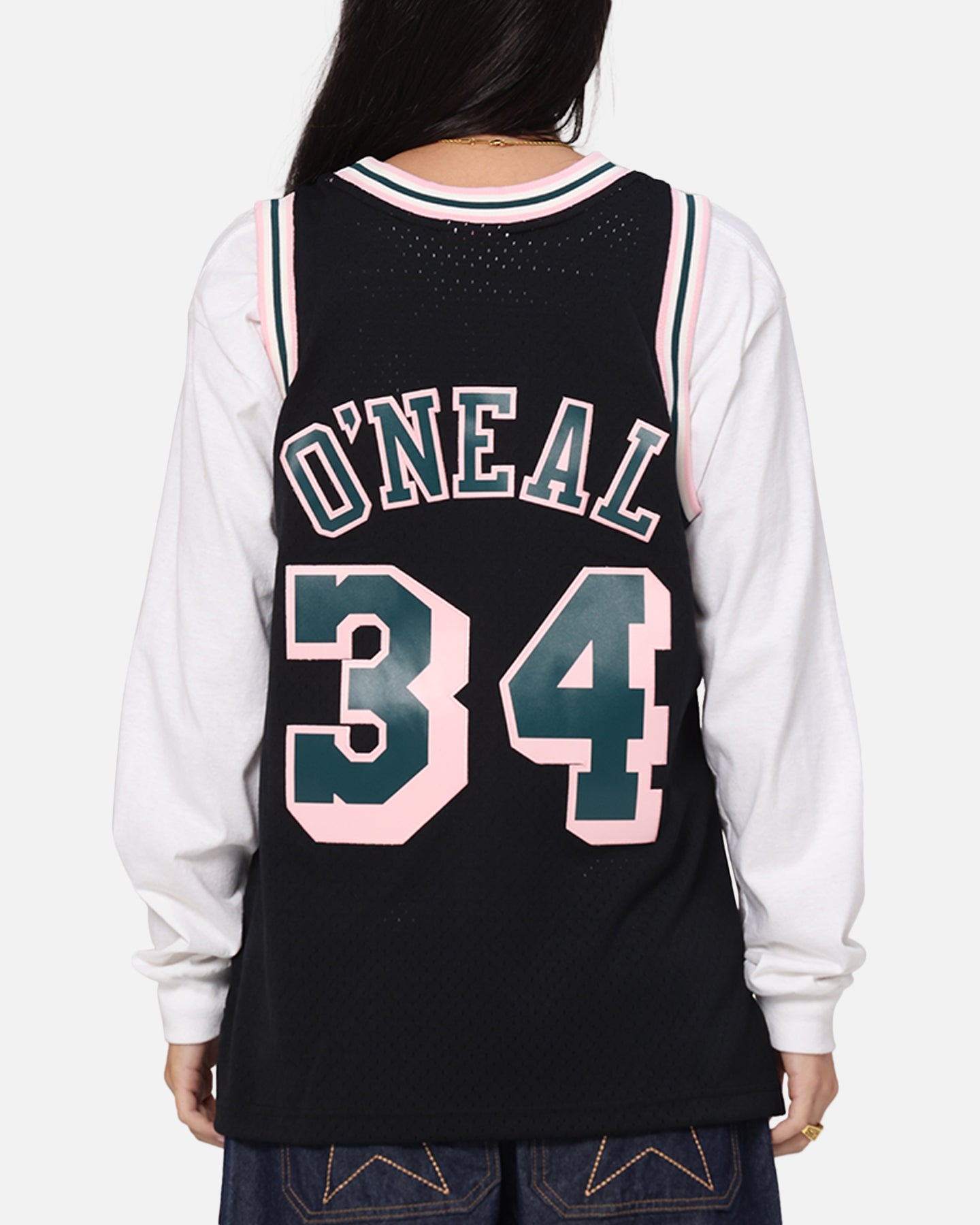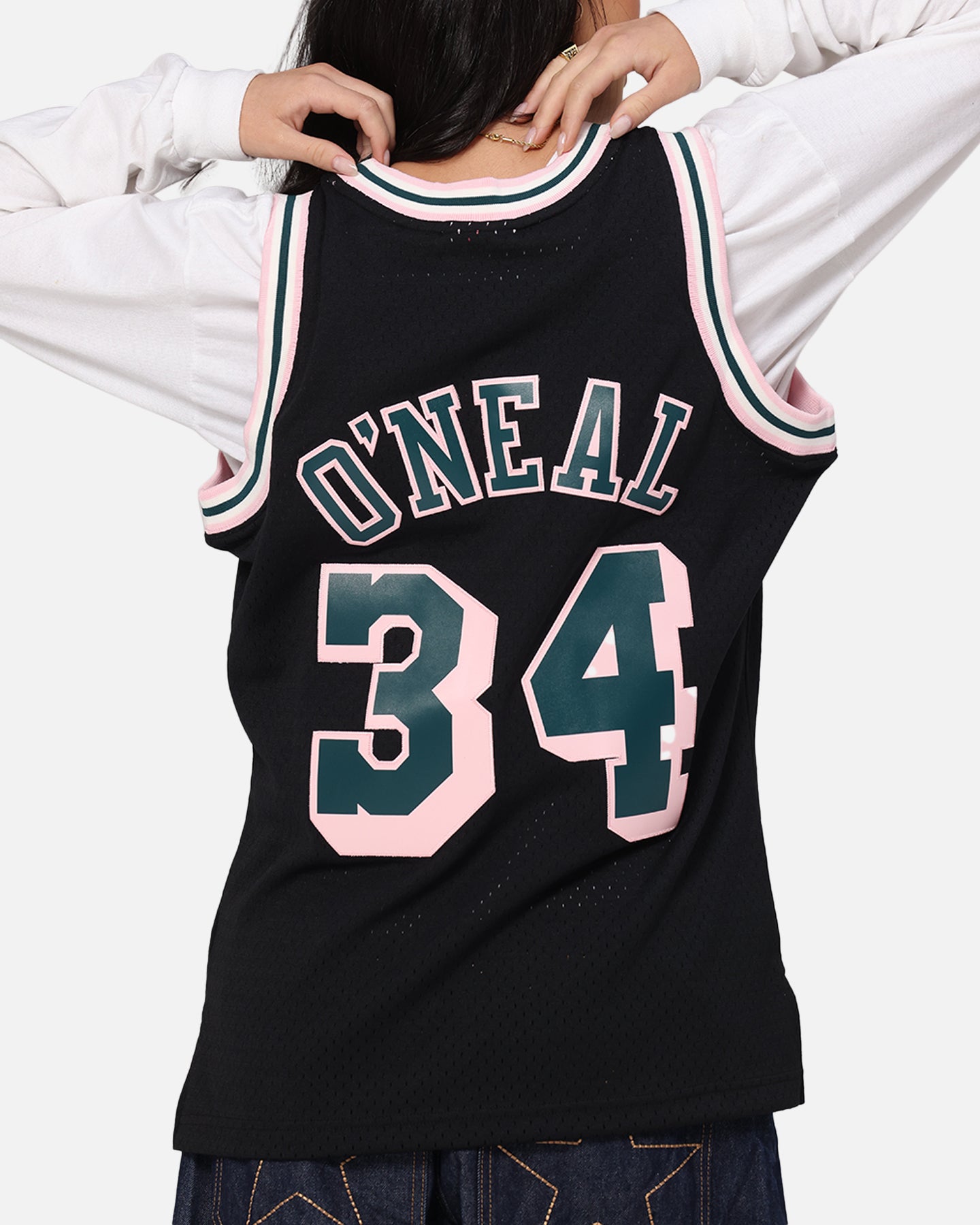 For all the ballers. The Los Angeles Lakers Shaquille O'Neal 'Deep Emerald' Swing Jersey is made with breathable polyester mesh with side vents to keep you cool. It's lined with anti-irritation ribbed trim at neckline and armholes for added comfort. Finished with player and team graphics and the NBA patch on the left shoulder for an on-court look.- Official merchandise- Mesh construction- Heat-applied screen printed twill graphics- Woven jock tag- Ribbed neck and armholes- Material: 100% Polyester- Colour: Black- Style: MNLL11849