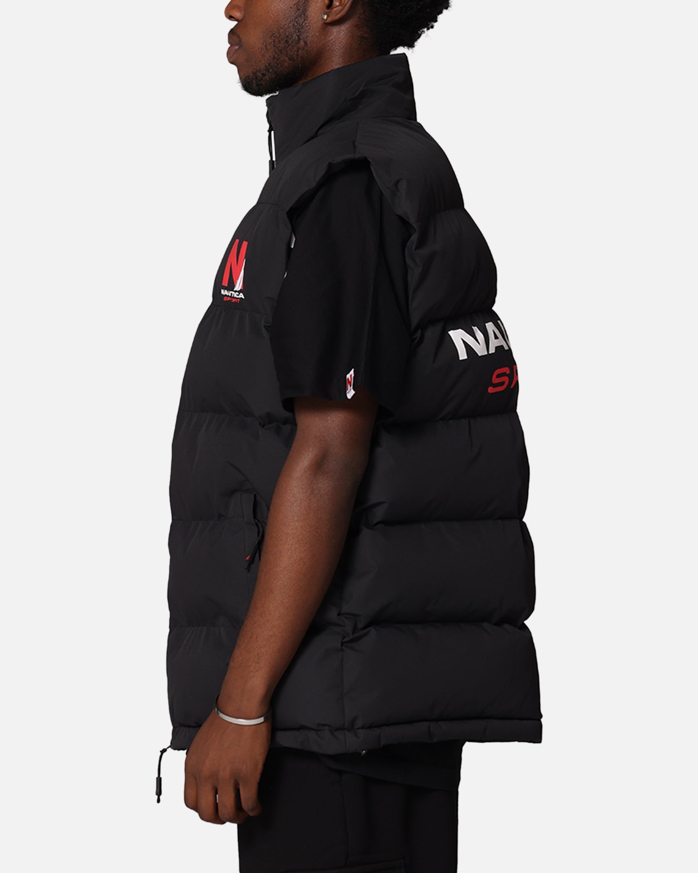 Elevate your layers with this midweight quilted gilet by Nautica. Its sleeveless design makes it perfect over a tee during cool evenings and adds extra warmth when worn over a jumper in winter. This puffer vest is complete with a full-zip closure and Nautica Sport branding on the back and chest. Cop yours today at Culture Kings.- Printed graphics- Funnel neckline- Full zip-up closure- Quilted- Rip stop fabric- Sleeveless- Regular fit- Material: 100% Polyester- Colour: Black- Style: NAN1M02062011