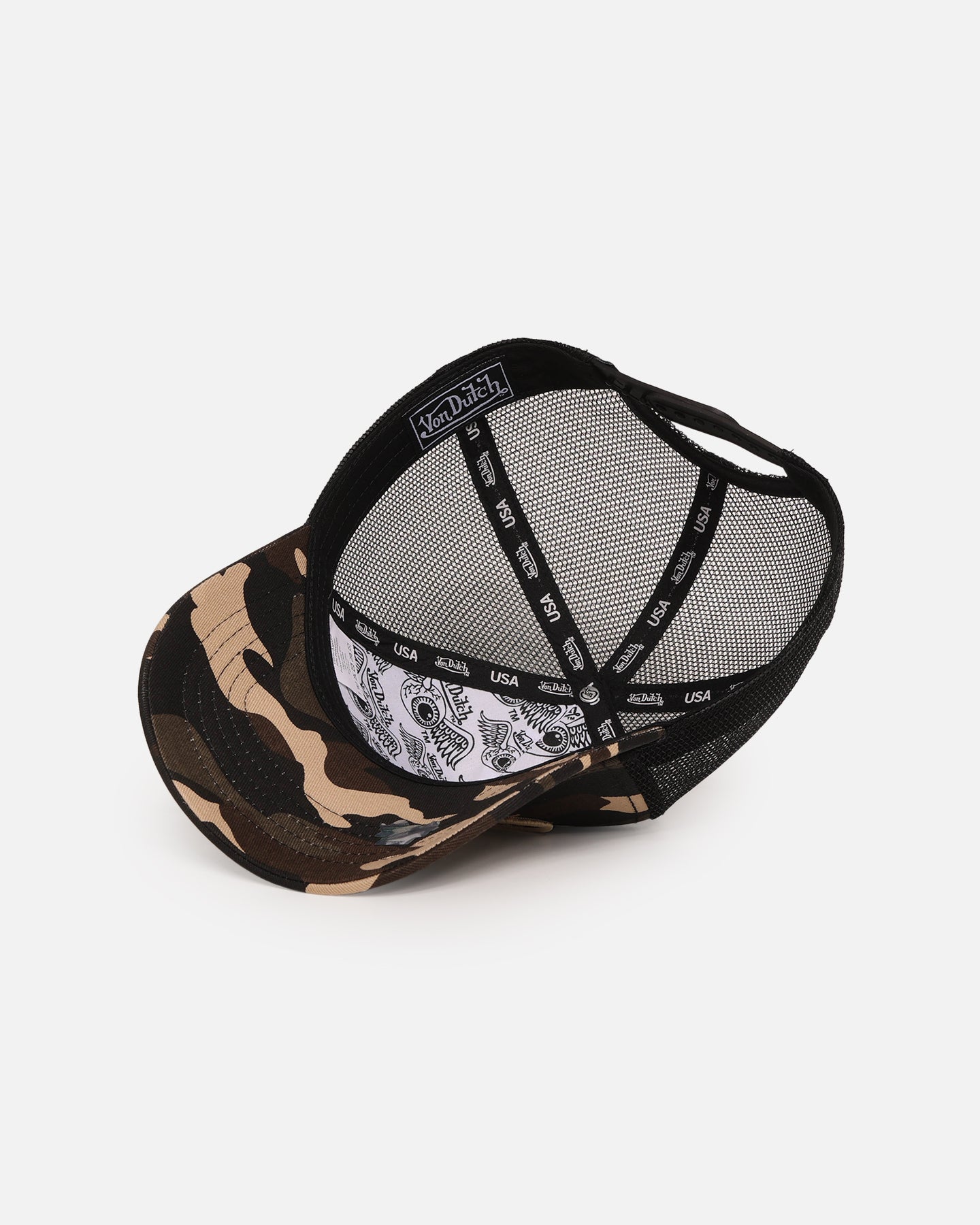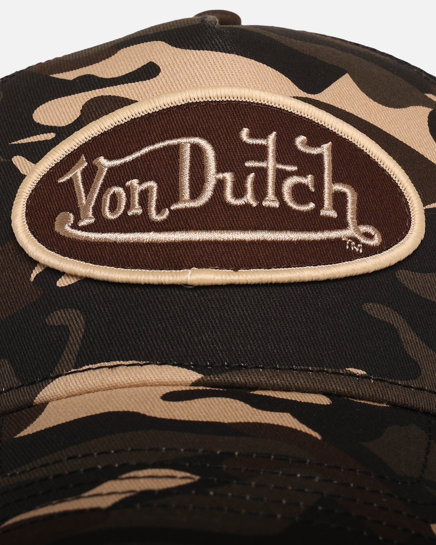 Finish off your 'fits with Von Dutch's fire new headwear drop. The Trucker Snapback Hat is built to last and look good doing so, featuring an embroidered logo, a snapback closure and a pre-curved brim, this piece is a must-have. Mesh back panels add breathability and that classic trucker feel. Secure yours today at Culture Kings while stocks last.- Embroidered logo- Adjustable snapback closure- Mesh back panels- All over camo print- Pre-curved visor- Colour: Brown Camo- Style: VDHT302